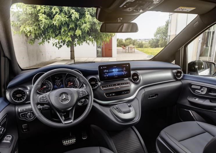 新车的整体内饰布局和V级车相似,只不过在中控悬浮屏幕的尺寸上有些差异,10.25英寸大屏所搭载的系统也经过了重新调整,整体UI设计继承了奔驰EQC的风格,功能上增加了充电设置、预设空调和能耗直方显示图等电动车特有的设置。此外该车内置导航可连接当前的电池充电状态,天气数据以及有关充电基础设施的信息,从而自动计算出一条快速舒适的路线。