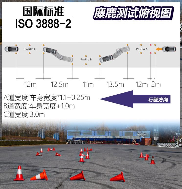 为了便于大家理解,我先简单介绍一下麋鹿测试的过程:原车道(上图A道)保持一定速度匀速行驶,发现障碍紧急向对向车道(上图B道)打方向躲避,然后再回到自己原来的车道(上图C道);参试车辆满油,且车上只有驾驶员一人,开启车身稳定控制系统,整个过程不踩油门和刹车,在车身不失控的情况下,速度由低到高逐渐升级,能通过的速度越快越好。