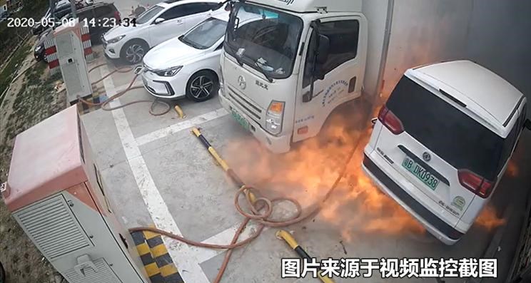 根据监控视频中的信息显示,2020年5月8日14时23分左右,一辆帅客EV停放在充电站内,充电与车辆处于连接状态,是否正在充电尚不明确。起初,视频中出现类似于燃放鞭炮时的噪音,随后该车车底冒出滚滚浓烟,之后车底发生爆炸,然后有火焰喷射而出,随即火势开始蔓延。
