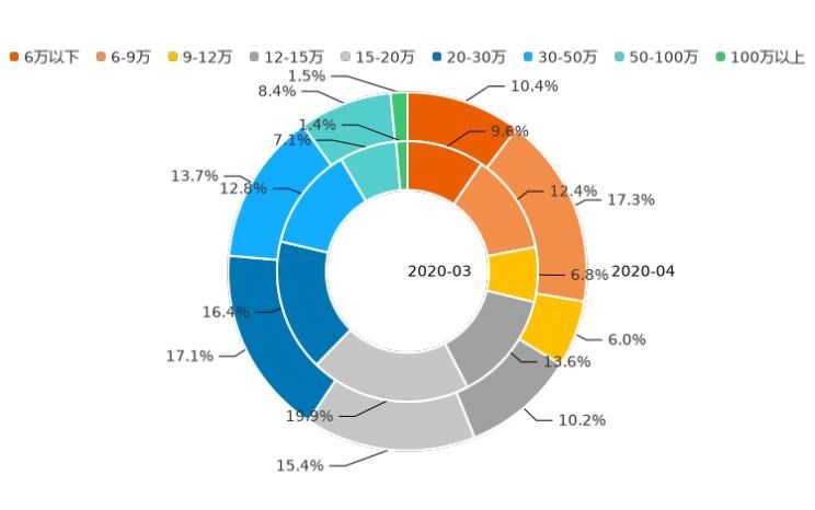 价格是用户购车时最主要的考虑因素之一,那么用户对不同价位车型的意向度究竟如何?今年4月,12万以下价区用户购车意向占比为25.1%,相较上月增加2.1个百分点;12-20万价区用户购车意向占比达32.2%,对比上月下滑2.7%;20-30万价区用户意向占比为21.1%,相较上月上涨1%个百分点;30-50万价区用户意向占比为12.9%,比上月降低0.4个百分点;50万以上价区用户意向占比为8.6%,较上月保持稳定不变。