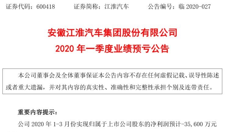 疫情期销量下滑 江淮一季度预亏3.56亿