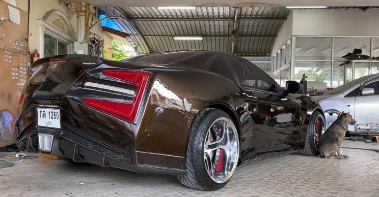 除了这台Veneno之外,视频展示了这家店里还有一些其他的作品,这台红色的车同样由丰田MR2山寨而来,看起来是台小号法拉利LaFerrari。这台棕色的是用本田Prelude山寨的法拉利……只能说它比较像法拉利,但是车尾又融入了一些自己的想法。在视频中我还发现了一个细节,就是这些山寨车虽然长得很像法拉利、兰博基尼……但是都没有悬挂法拉利和兰博基尼的车标,而且很多还有自己的名字,这让我想起了《GTA5》里的亚班尼、皇霸天……想必这也是为了避免吃官司的一种做法,毕竟我记得去年有个国外新闻:一对父子做山寨超跑拿来卖,后来被警察找上门了……