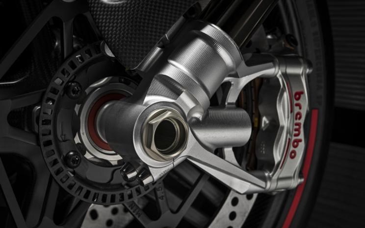 Superleggera V4的其他标准件包括轻量化的?hlins悬架系统、加压?hlinsNPX25/30倒置式43mm前叉以及?hlinsTTX36后减震器。钛合金后减震器弹簧以及装配MotoGP赛车配备的后减震阀系统,这些减震阀可改善初始压缩阶段对道路颠簸的阻尼。Superleggera V4的制动系统采用Brembo产品家族中的顶级型号,Monobloc Stylema R卡钳配备有带远程调节器的MCS径向前泵,这套制动系统可在长距离行驶中提供最大的制动行程一致性。