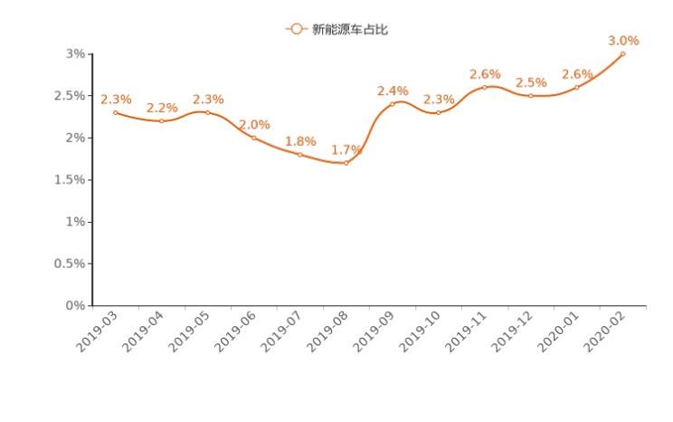 今年2月,乘用车中新能源车用户购车意向占比为3.0%,相较上月小幅上涨0.4%,意向度继续提升。在政策、市场、产品等因素的驱动下,新能源车近年迎来较快发展,乘用车市场新能源意向占比不断增长。从下图中可见,2019年新能源车用户意向占比最低的情况出现在7、8月份,这与当年新能源汽车自6月26日起补贴标准退坡正相吻合,说明7、8月份的用户对新能源汽车意向度的下降与补贴退坡直接相关。不过随着车企应对补贴退坡的策略逐渐实施,以及新能源产品力和服务能力的提升,新能源车用户意向占比已在逐步回升、平稳发展。