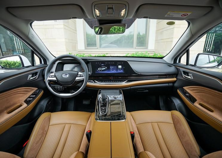 内饰方面,新车中控台造型简洁并采用皮革包裹,垂直的全液晶仪表和中控液晶显示屏仿佛连成了一整块屏幕,带来比较好的视觉感受。功能上中控屏幕搭载广汽新能源AI系统2.0,包括导航、车载QQ音乐、AI智能语音控制等功能,同时全系配置车型支持OTA远程升级、4G无线网络服务。