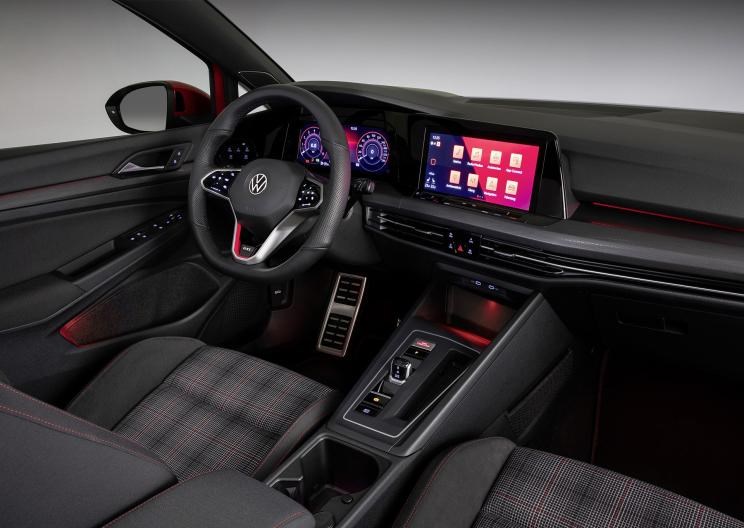 内饰方面,全新高尔夫GTI保留了普通版第八代高尔夫的整体布局,物理按键被大量取消,空调出风口改为家族通用的贯穿式设计。另外,10英寸全液晶仪表、悬浮式中控屏、平底式多功能方向盘、与保时捷911同款的电子挡把,以及带有格子布和红色缝线的一体式运动座椅,都增强了内饰的科技感和运动感。