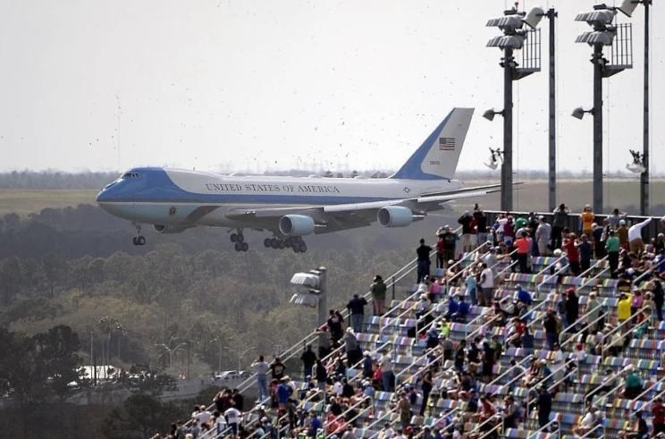 美国当地时间2月16日下午1点左右,特朗普夫妇乘坐空军一号专机飞抵位于佛罗里达州的Daytona国际赛车场,专机飞跃赛车场后降落在赛道相邻的Daytona国际机场,几分钟后特朗普夫妇乘坐他的“野兽”防弹车驶入场地内。