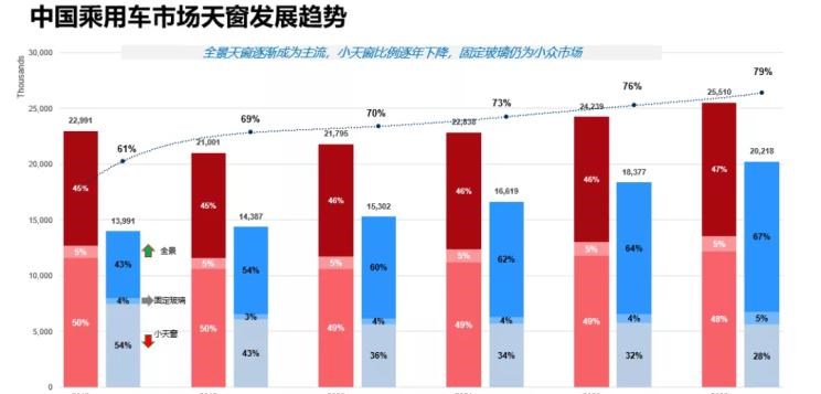 『全景天窗逐渐成为主流,小天窗比例逐年下降』