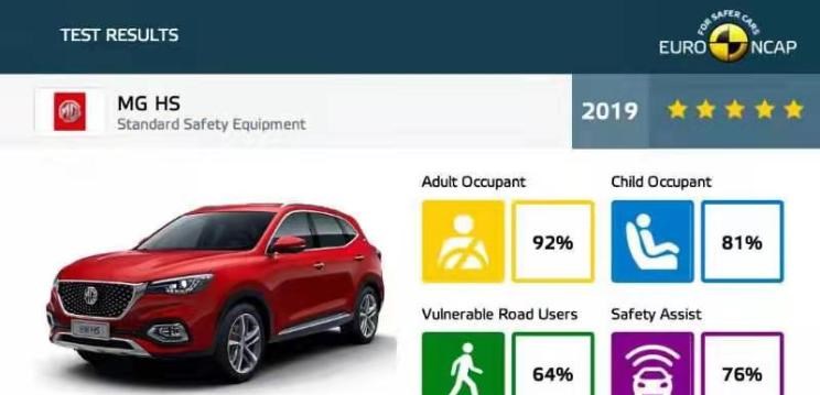其中,名爵HS在驾驶员和乘客保护的得分分别为92%和81%,同时,其主动安全以及交通参与者保护的得分分别为76%和64%,其整体表现较为均衡,致使该车得到五星的好成绩。