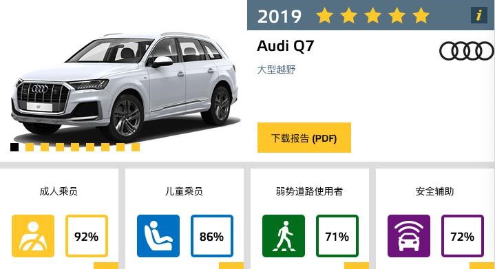 此外,奥迪Q7和奥迪Q8也凭借扎实的做工以及丰富的配置为其得到五星成绩。具体来看,奥迪Q7在驾驶员保护、乘客保护、主动安全以及交通参与者保护的得分分别为92%、86%、72%以及71%。而奥迪Q8成绩分别为93%、87%、73%以及71%。