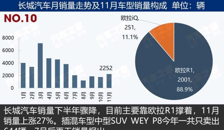 11月国内新能源乘用车批发销售8.03万辆,虽环比小幅回升,但较去年同期依然出现40%的较大降幅,往常的“年底效应”没再出现,新能源车市依然处于下行通道。企业层面,仅冠军比亚迪一家的销量超过万辆,其他都不足万辆,而且只要销量能超2000辆,就能上Top 10榜单,行业过冬气息可以说是很浓郁了。