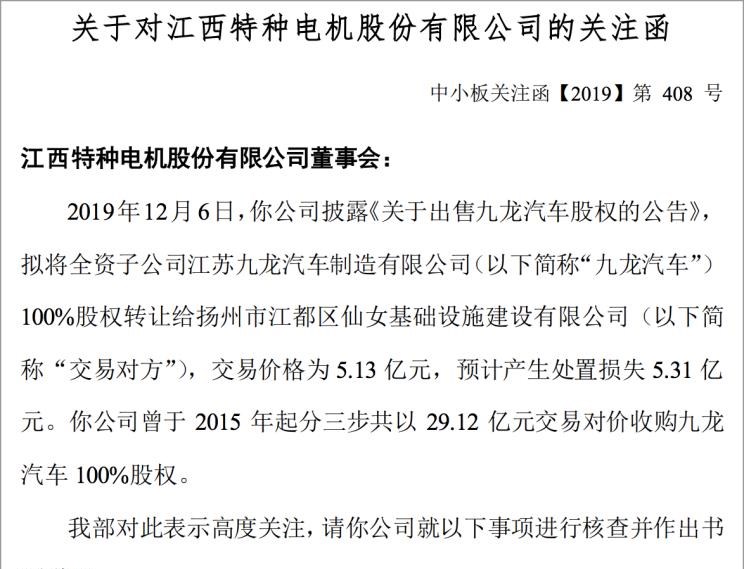 29亿元买进5.3亿元卖出,因涉嫌非合理性折价出售,江特电机关于九龙汽车100%股权的交易事项受到深交所关注。12月9日晚间,江特电机100%股权、交易价格评估标准等问题做出说明。