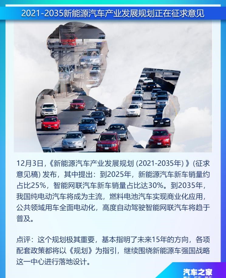 进入12月,常规动作是要回顾总结一番:年初立的那些Flag都实现了吗?准备好立目标了吗?话说回来,在年关承转之时,国家高瞻远瞩拟定了未来15年的新能源汽车发展规划,现在正征求意见,给寒冬中的汽车业尤其是新能源圈送来了定心丸。产业大方向怎么定、今年销量预测、特斯拉获补贴......众多热点事件,请一一往下看。