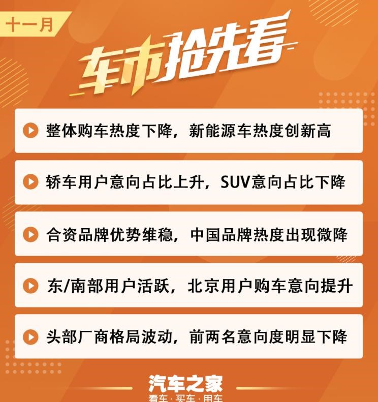 艾瑞巴蒂大家好,又到了通过大数据解读车市动态的时间。在刚刚过去的11月份,有两个同时影响车市冷暖的因素存在:一方面,一年一度的广州车展如期而至,多家车企推出了新产品和新服务,这或许会给车市带来一些热度;但另一方面,经历了车市“金九银十”的黄金期后,11月份很容易出现购车热度下降的态势。那么总体来说,11月份的车市数据到底呈现出哪些新特点?一起通过数据了解下。