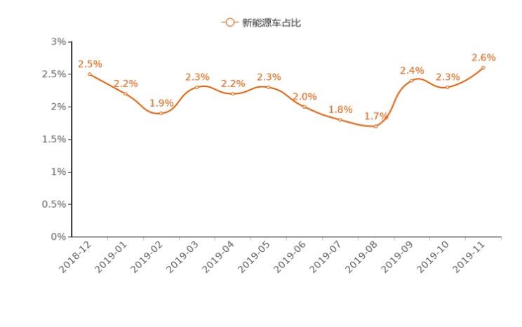而在新能源车领域,今年11月的用户购车意向占比为2.6%,相较上月上涨0.3%并达到了今年的最高水平。从下图中可见,截止目前,今年新能源车用户意向占比最低的情况出现在7、8月份,而这与国内新能源汽车自6月26日起补贴标准退坡正相吻合,说明7、8月份的用户对新能源汽车意向度的下降与补贴退坡直接相关。不过随着车企应对补贴退坡的策略逐渐实施,以及新能源产品力和服务能力的提升,新能源车用户意向占比已在逐步回升。