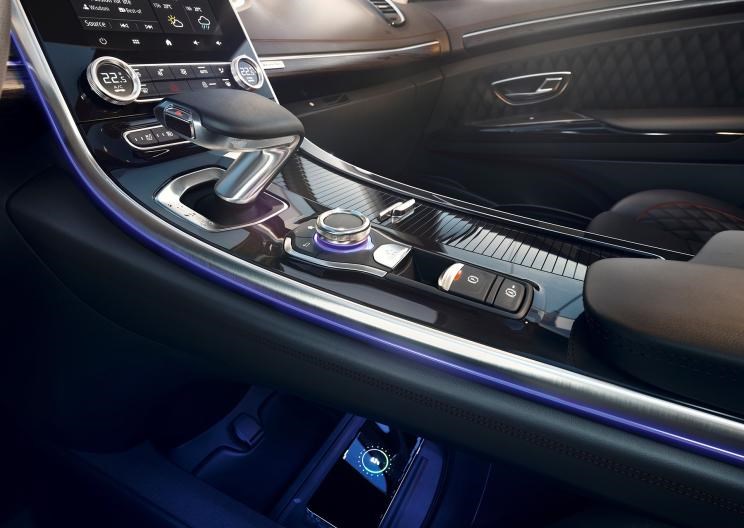 新款Espace的内饰在整体布局上延续了现款车型的设计,但材质、配色和细节处理都得到了更具档次感的提升。在电子挡把后方的下部中控台部分,新车采用了新的布局,包括储物槽位置和扶手箱造型等都有所调整,挡把下方的夹层里还加入了手机无线充电板。此外,新款车型的空调控制旋钮上加入了温度显示,按键布局也经过优化,显得科技感十足。
