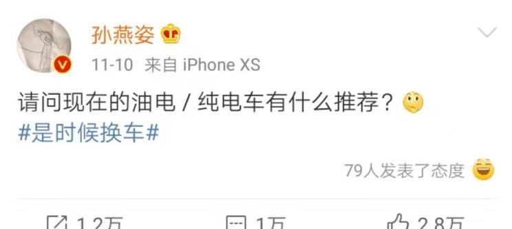11月10日中午,新加坡歌手孙燕姿在某社交平台发布了一条消息,短短的几个字“请问现在的油电/纯电车有什么推荐”,引得网友纷纷留言,该条消息转评赞数量分别达到1.2万、1万、2.8万;同时更有不少于30家车企纷纷在评论区为自家品牌“打下广告”,评论区异常热闹。