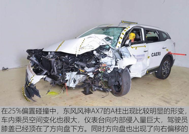 而成绩比较差的东风风神AX7不仅耐撞性和维修经济性得分不高,在正面碰撞以及行人保护方面同样获得了比较低的分数。