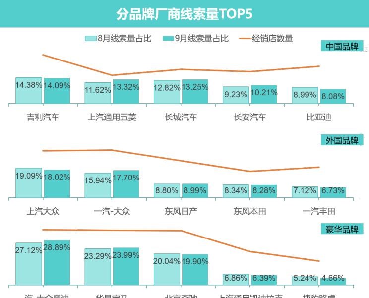 整体来看,9月中国品牌的TOP5线索量分布相对比较平均,而外国品牌和豪华品牌阵营的寡头现象显著。其中,得益于旗下多款车型线索量环比上涨,一汽-大众奥迪单品牌份额接近1/3。奥迪线索量中,包括全新海外谍照曝光的奥迪A3,全系5-7万优惠的A6L,法兰克福车展亮相的全新一代RS 7Sportback等。此外,销量主力Q5L也抓住了成都车展的机遇,给出了全系8折的优惠力度,再加上优惠更高的上一代国五车型清库,吸引了更多潜在消费者的关注。新闻的高曝光和终端优惠,都与线索量的增长息息相关。