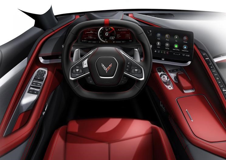 内饰部分,新车保留了上一代车型上环抱式的设计,但整体造型更富有设计感。新车的中控台几乎将所有的控制按键和旋钮放置在了驾驶员右侧的面板上,前端直立的仅有一块大尺寸的中控液晶屏,而驾驶员右侧面板竖起部分集成了造型奇特的按钮式挡把、带有软质拨杆的多媒体控制旋钮以及右侧上方的一整排各种功能按键,科尔维特C8在内饰设计上的创新可谓是让人眼前一亮。