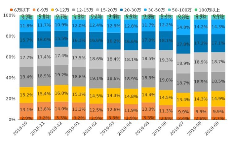 通过分析近12个月的用户意向数据发现,2018年10月至今年9月,12万以下价区用户意向占比降低3.7个百分点,随着人们收入水平提高,低价市场需求有所收窄;12-20万价区用户意向占比上涨0.1%,市场热度保持小幅增长;20万以上价区意向占比,上涨3.8个百分点,其中,30-50万市场热度保持一定增长,得益于汽车用户置换升级需求等因素的带动,近12个月用户意向占比上涨2.5个百分点。未来,消费升级及汽车置换周期的到来,将进一步利好中高端市场的发展。