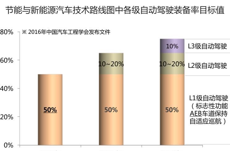早在2015年工信部关于《中国制造2025》的解读中,就提到了涉及AEB的智能网联汽车概念,并明确了其发展目标。到了2016年,中国汽车工程学会发布的《节能与新能源汽车技术路线图》中,更明确指出,到2020年搭载L1水平的驾驶级功能新车市场占有率要达到50%,换句话说,即在明年,AEB的新车搭载率目标是达到50%,并以此为基础,到中远期的2025年及2030年,AEB的新车搭载率依次要达到70%和近80%。