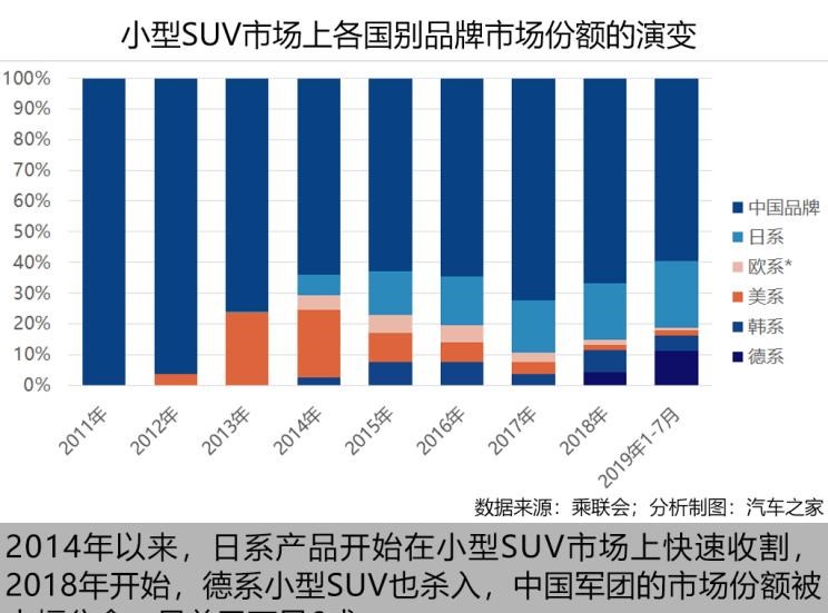 最早,只有美系的昂科拉和翼博两款小型SUV与中国品牌共处。2014年,日系车缤智和锋驭杀入,之后本田XR-V也杀入,并且销量一路攀升,2019年日系车奕泽IZOA与前面三款车一起,快速抢占了中国品牌在小型SUV市场上的份额。今年前7个月累计,中国品牌小型SUV的市场份额已经不足60%。
