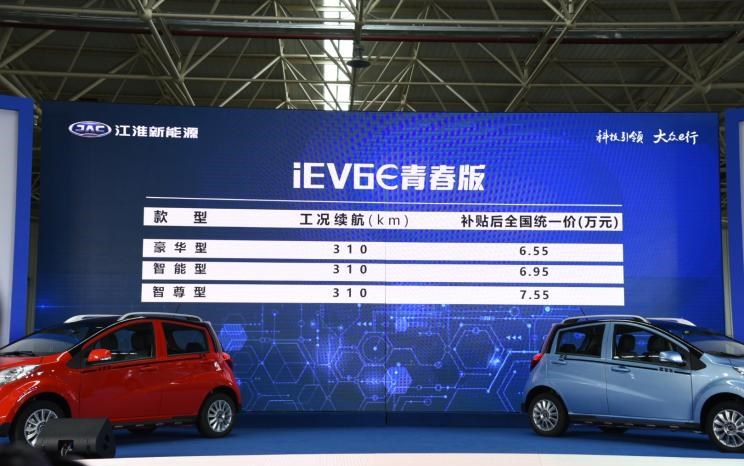 江淮iEV6E青春版 指导售价车型补贴后统一售价豪华型6.55智能型6.95尊贵型7.55