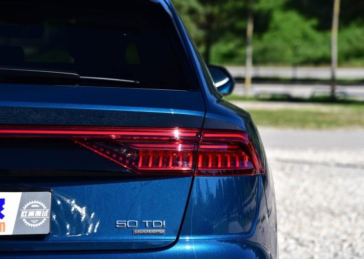 车尾部分,奥迪Q8采用了贯穿式OLED尾灯组,尾灯中央面板采用亮黑色涂装,其上镶嵌有奥迪四环LOGO。整体来看,Q8尾部的线条层次非常丰富,除了平直硬朗的尾门线条外,还包括底部造型复杂的后扩散器。另外该车还配备了双边共两出式排气。