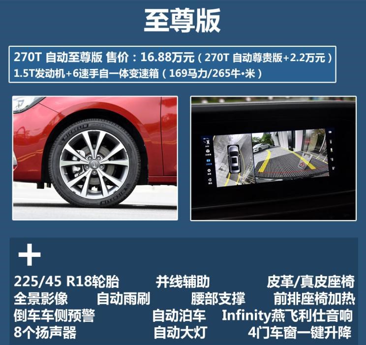 最后让我们再来看看全系的顶配车型——至尊版。其在尊贵版的基础上增加了自动大灯、自动雨刷、全景影像、皮革/真皮座椅、4门车窗一键升降等配置,个人认为这些并不是特别高级,但又颇为实用的功能应该下放到配置稍低的车型上更为适合。当然,诸如Infinity燕飞利仕音响、8个扬声器以及自动泊车等功能还是体现出顶配车型的高级感、档次感。