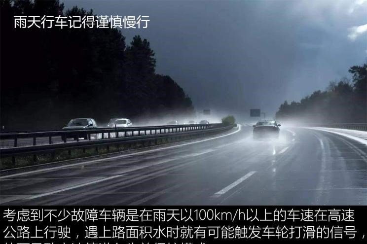 高速旋转的轮胎压到水膜上时,水会通过轮胎花纹形成的沟槽排走,从而保证轮胎与路面接触产生抓地力。轮胎花纹沟槽排水能力是有限的,暴雨在高速公路路面形成的较厚水膜有可能超出轮胎沟槽排水能力,这会导致车轮产生打滑。这种打滑一般会触发ESC电子稳定系统,短暂地限制发动机动力,但在极端情况下也能使变速箱进入失效保护模式。