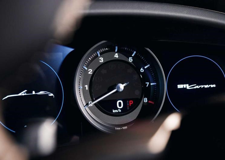 内饰方面,新一代911在传承经典的同时,也更加注重科技属性。新车继承了以往代别911车型的五连表式仪表盘,但除中央的转速表为机械指针式外,左右两侧的四个表盘均已升级为液晶屏幕显示,显示内容包括时速、水温、机油温度、油量等信息。与此同时,新车配备了全新样式的三辐式多功能方向盘、电子挡把,而中央的空调出风口和空调控制区也被移动到了挡把前方的中控台T形区域的拐角处。