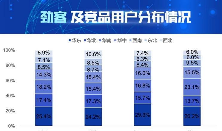 从用户下单数据来看,劲客及其竞品用户主要集中在华东、华南地区。劲客用户量Top 3省份分别为广东、山东、河北,Top 3城市分别为北京、东莞、武汉;逍客用户量Top 3省份分别为广东、山东、湖北,Top 3城市分别为北京、武汉、东莞;本田XR-V用户量Top 3省份分别为广东、江苏、山东,Top 3城市分别为北京、武汉、西安;缤智用户量Top 3省份分别为广东、江苏、山东,Top 3城市分别为北京、佛山、广州。劲客与其竞品用户来自广东、山东、江苏等省份的最多。竞品圈各车系在北京、武汉、东莞等城市的市场争夺最为激烈。