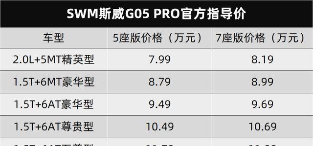 SWM斯威G05车型过去的产品卖点便是大容量,4710/1855/1770Mm的三围出示非常好的功能分区基本,因此 PRO车型除开原本的5/七座车型合理布局以外,又增加了6座版车型。