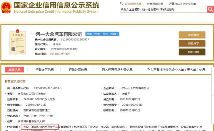 值得一提的是,根据国家企业信用信息公示系统公布的信息显示,一汽-大众汽车有限公司经营范围已变更为大众、奥迪和捷达系列乘用车等,由此来看,“捷达”就是上述所提到的第三驾马车已是板上钉钉。据汽车之家了解,现款一汽-大众捷达车型将会于8-9月份换标生产。
