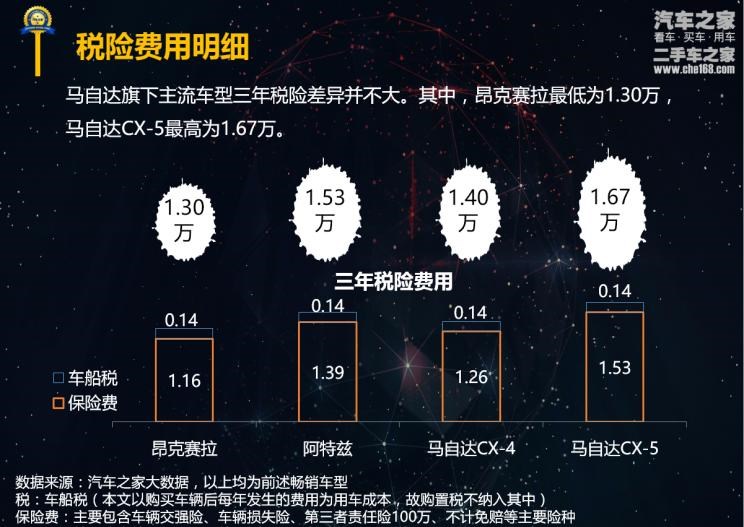 此次对比的四款马自达旗下主流成型三年税险差异并不大,其中指导价最低、排量最小的马自达3 Axela昂克赛拉税险费用最低,为1.30万元;而相较而言马自达CX-5因为指导价、排量以及车型等级等因素,因此马自达CX-5的各种税险费用最高,达到1.67万元。