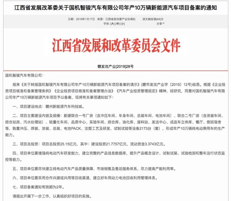 日前,汽车之家从江西发改委官方网站获悉,江西发改委已同意对国机智骏汽车有限公司年产10万辆新能源汽车项目予以备案。