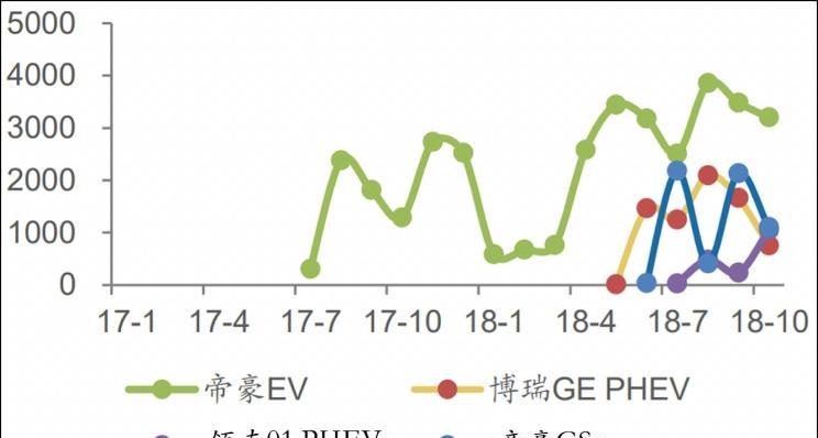 接下来重点看一下吉利产品的实际生产和销售情况。从下图可以看出,吉利新能源产品2018年的销量波动较大,帝豪EV、博瑞GE PHEV、领克01 PHEV、吉利GSe四款新能源汽车在10月份的合格证数量,分别约为3200辆、1100辆、1000辆、750辆。