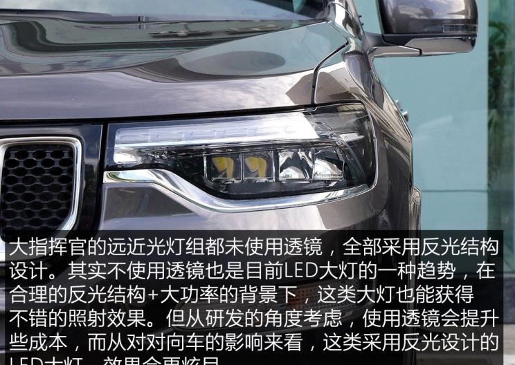 说实话,在这个肉欲横飞的年代,在评测文章中,全系标配这词的出镜率并不高,究其原因无非是销售策略层面的因素。但看到大指挥官全系标配的LED大灯,心中还是有些小小的悸动。都说天才与傻子就在一线之间,要我说Jeep要么是太精明,要么就是太傻。低配弄卤素,高配整LED,您要非想来个全套LED,成啊!选装吧!各种捆绑灯光升级包招呼着。这是太多厂商的惯用手段了,但Jeep大指挥官标配的做法要么就是深谙销售之道,要么就是不屑这么做。还有一点也许是这全系标配的LED大灯压根儿就是一团“烛光”,标配就标配了不差钱!所以我们这回要仔细看看这款全系标配的LED大灯到底是名副其实还是滥竽充数。