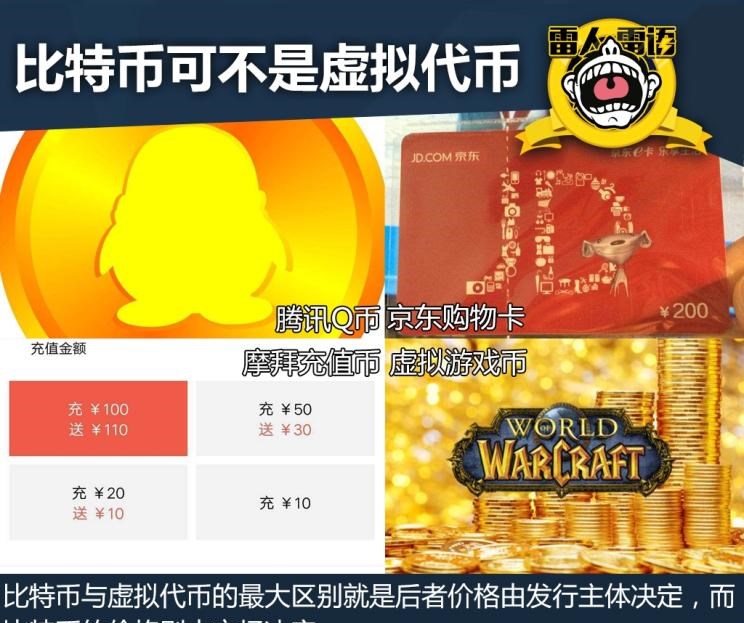 虽然都有虚拟网络货币的属性,但是像比特币这种数字货币和我们说的虚拟代币还有很大的区别,这点大家一定要搞清楚。虚拟代币多为公司或者企业自己定价推出的,属于企业内发行的虚拟代币,比如我们常见的Q币、各种网络游戏中的金币、摩拜/小黄车的充值币,它们最大的特征是“中央集权制”,也就是发行主体对所发行的币种有百分百的控制和解释权,币种的价值也相对稳定。