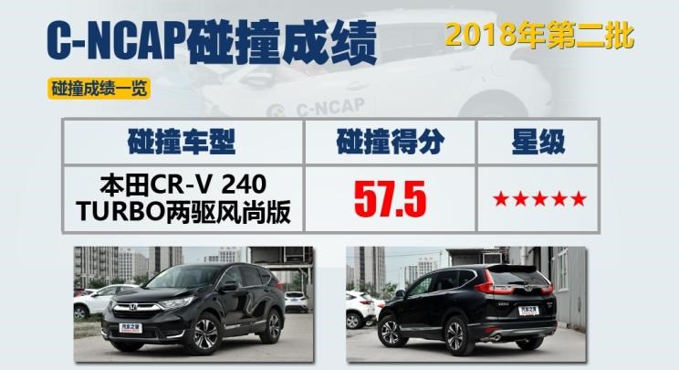 试验车型:东风本田汽车有限公司 思威牌/CR-V DHW6463R1CSE型多用途乘用车;碰撞成绩:57.5;评级:★★★★★。