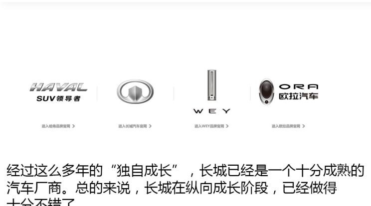 从早期的轿车、皮卡、SUV三驾马车共同发展,到抛弃轿车、发展皮卡、主推哈弗SUV品牌,再到皮卡、哈弗SUV品牌、欧拉品牌以及中高端品牌WEY的协同个发展,长城的业务架构已经相对平稳。对于现有业务,长城需要做的是保持哈弗SUV品牌的市场优势地位,完成中高端品牌WEY的快速成长。总的来说,长城在纵向的自我成长阶段,已经做得十分不错了。