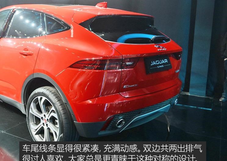 捷豹E-PACE定位紧凑型SUV,长宽高分别为4411/1900/1649mm,轴距为2681mm,与海外版的差异是车身长度增加了16mm。整车采用轿跑SUV的设计风格,外观上与海外版基本一致,车头造型较为圆润,圆角矩形的大嘴式格栅与前包围两侧的巨大进气口让前脸的辨识度很高。车尾主打运动风,犀利的尾灯与双边共两出排气筒都是强调运动的设计元素。