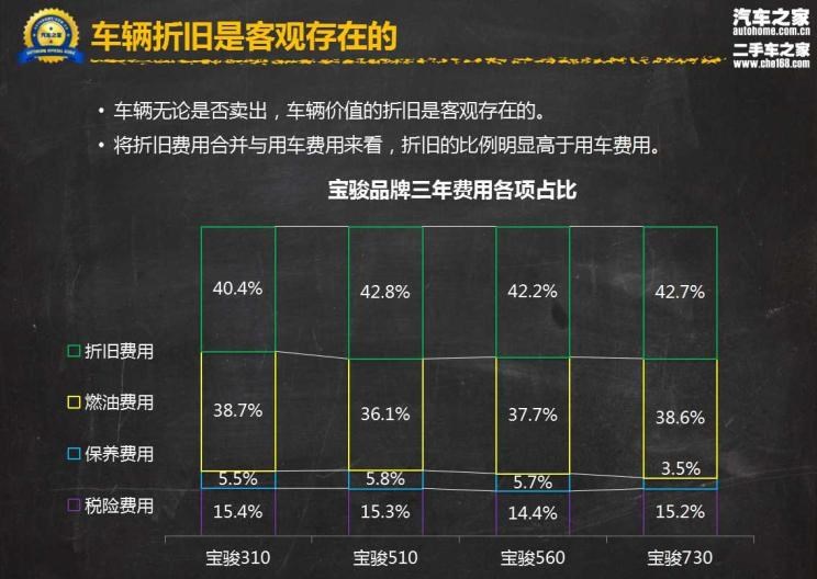 本文涉及到的具体车型包宝骏310、宝骏510、宝骏560、宝骏730,级别涵盖小型车、小型SUV、紧凑型SUV、MPV四个不同级别,销量表现在各级别中也是非常出色的,具有一定的代表性。单从用车成本上看,宝骏560的支出最高,达到了4.54万元,同时其购买成本也在四款车型中最高,达到9.09万元,合计13.63万元。这是基于用户拥车三年后并不打算卖车的情况下测算得出。