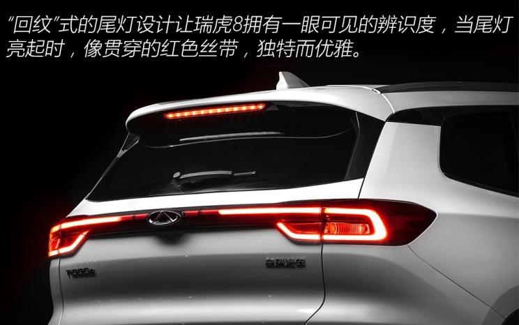 瑞虎8的车身与车窗比例为2:1,18英寸轮圈带来稳重的车身姿态。车尾设计与车头相得益彰,通过延伸至车身侧面的尾灯线条,视觉上增强了车身的横向宽度。尾灯造型的设计灵感源自我国传统木构建筑中的窗棂,尾灯点亮后光线向两侧延伸,犹如红色丝带般包裹着车尾。
