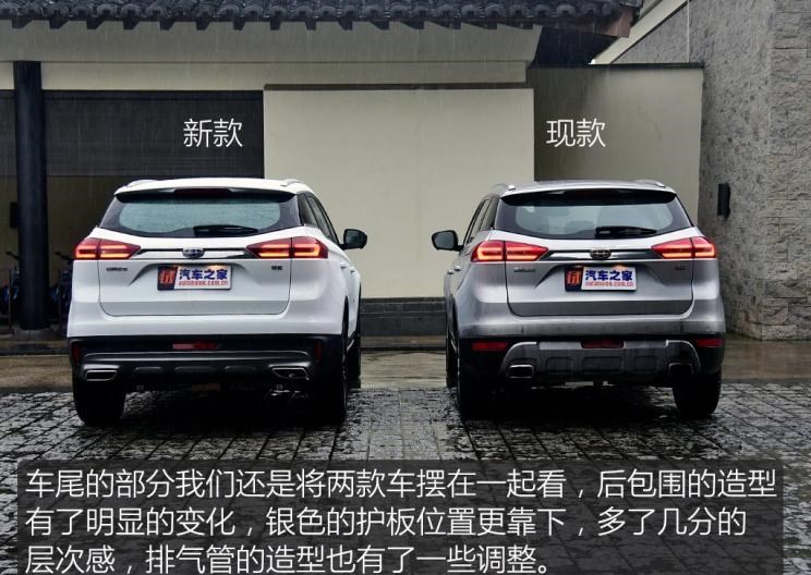 新款博越车尾灯组采用熏黑处理,下方银色护板的造型有所变化且位置更靠下,内嵌双边共两出式镀铬排气口,整体营造出更有质感的视觉效果。