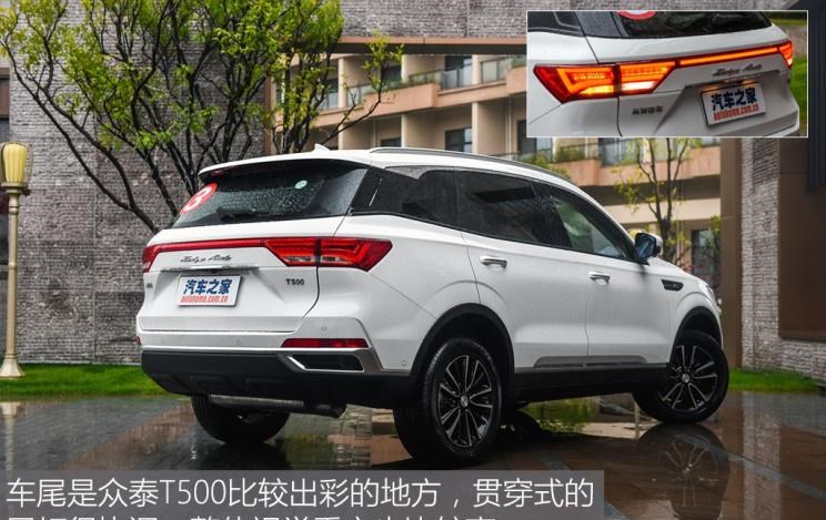 新车侧面使用了时下流行的悬浮式车顶设计,看上去具有很强的气势。同时,新车尾部造型饱满,一条上扬的腰线贯穿至尾部。值得一提的是,新车尾灯组还采用贯穿式设计,看起来十分时尚。在车身尺寸方面,众泰T500长宽高分别4632/1850/1695mm,轴距为2700mm。
