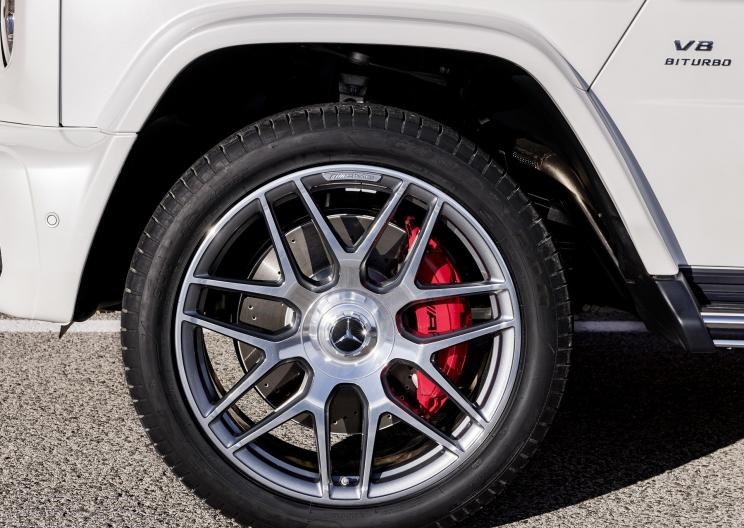 车头部分,新AMG G 63最明显的改变在于换装了一款与新款AMG GT车型风格一致的前格栅造型,其内部由12根竖置镀铬饰条组成,看上去非常个性。与此同时,新车的保险杠进气口相比此前全新G 500也有所调整,保险杠下部进气口的尺寸相比新G 500车型更大,并且还可选装银色的加强前防撞杠。此外,官图中的新G 63采用了一套双七辐式22英寸轮圈和大尺寸红色刹车卡钳,视觉效果极具运动感。