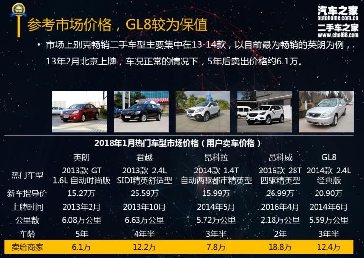 通过分析2018年1月份别克品牌热门车型的二手车市场价格我们可以发现,市场上别克畅销的二手车主要集中于2013-2014款,其中2013款英朗GT 1.6L自动时尚版、2013款君越2.4L SIDI精英舒适型、2014款昂科拉1.4T自动两驱都市精英型、2016款昂科威28T四驱精英型,以及2014款GL8经典版这五款车型的品牌保值率相对于同车系的其它车型较高。