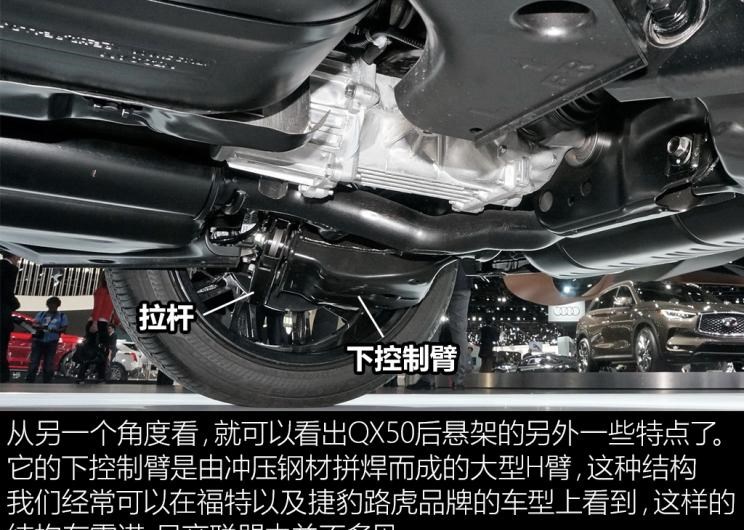 看过前悬架后,再来看看后悬架。我们刚刚说过QX50已经更换为橫置布局,那么它是否来自于现有的车型平台呢?后悬架是一个最容易找到答案的地方。
